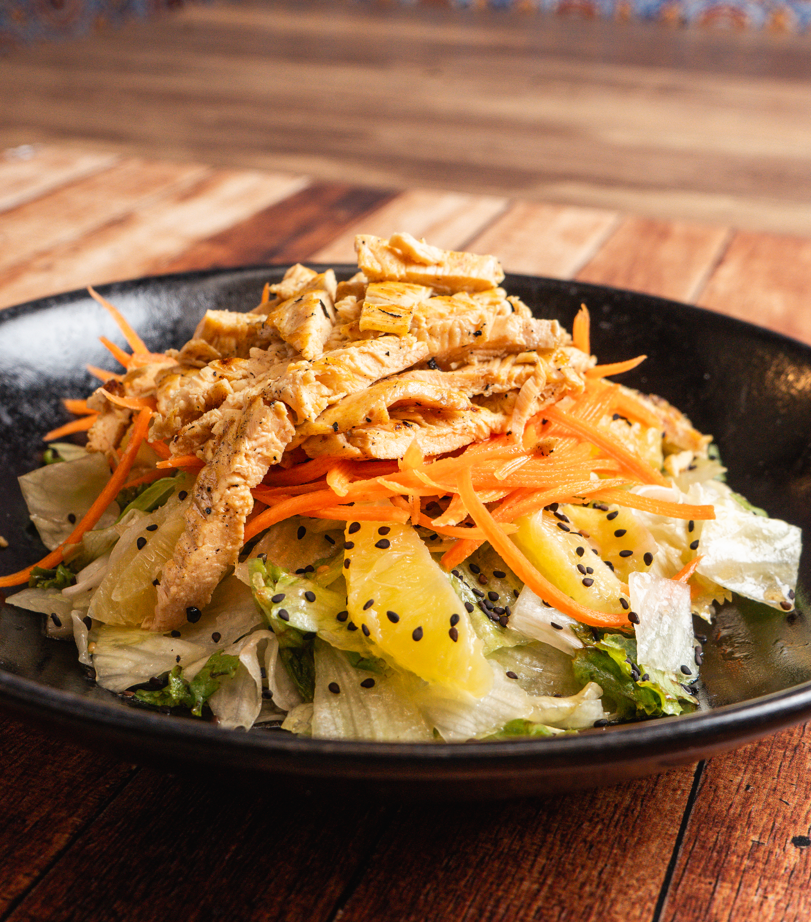 Mezcla de lechugas, zanahoria, naranja y ajonjolí negro con aderezo de la casa y una jugosa pechuga de pollo (120g)