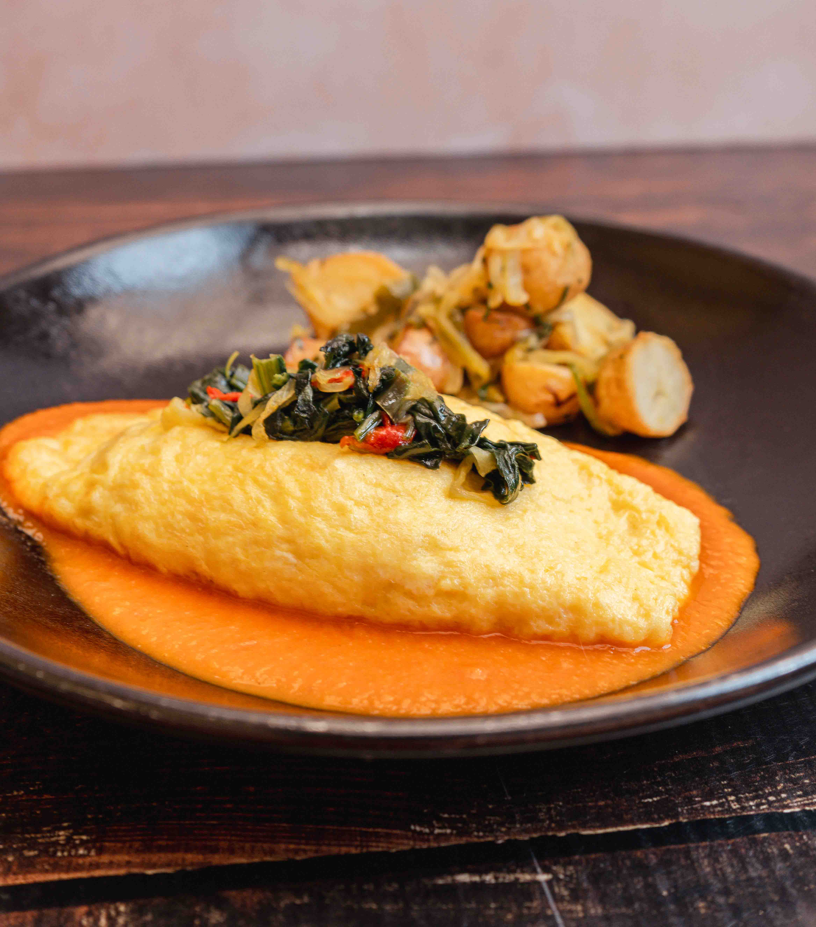 Exquisito omelette preparado con espinacas saute (60g) y papa cambray guisada, sobre salsa de jitomate